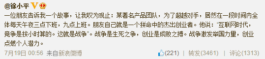 然后,@玄了个澄的在微博里at我说,他在微信里看了@Fenng 关于加班的言论,希望我评论一下。我看了一下大辉的文章,虽然写得有点散乱,但是我和他的一些观点还是很类似的,我主要在这里加强一下我的看法。