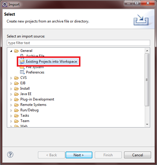 In the import window, under "General" select "Existing Projects into Workspace" and click next