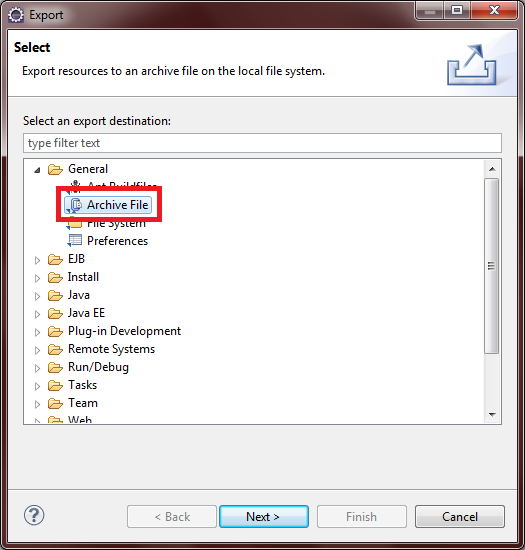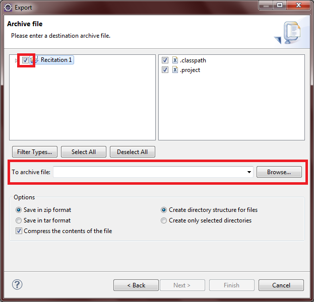 Make sure that the checkbox next to the project name is checked. If it is not checked then that means that not all of your files will be exported - which is bad. Then, select a name and destination to save the file. Click finish.