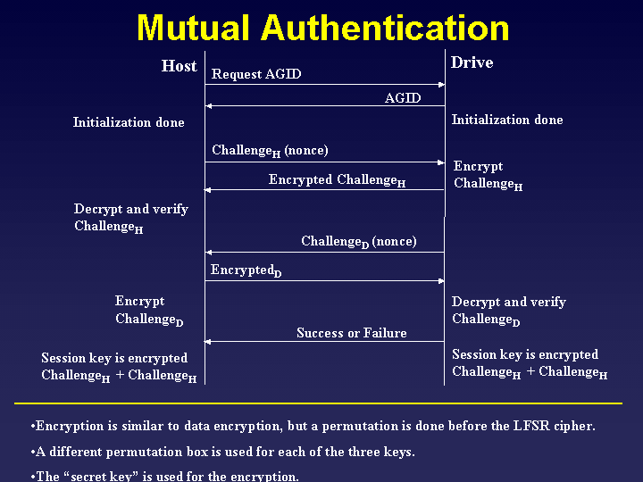 - The host and the drive use a challenge-response system to establish their trustworthiness to each other. In the process, they negotiate a session key.