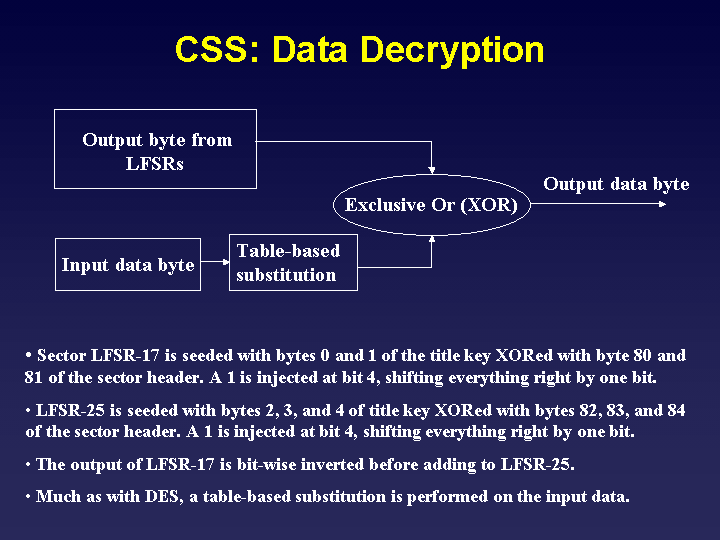 As we'll discuss shortly, CSS is based on two Linear Feedback Shift Registers (LFSRs). Although very efficient in hardware, LFSRs are somewhat inefficient to implement in software, and there are some interesting programming techniques that are used to speed up the process. Unfortunately, I do not believe it is lawful for me to show that code, or equivalent code, to you today -- for that reason, I will not. Unfortunately, the same concern leads me to suggest that you refrain from reviewing the DeCSS source code after this lecture. Unlike my suggestion to review an implementation of DES, obtaining source code for DeCSS may well violate federal law. So today, you will literally get, "As much of an education as the law allows -- and no more."