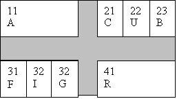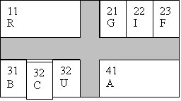 shuffle.inMTU, Inc., is a multi-national software developer with office buildings in several cities. � As part of a corporate reorganization, the company�s leaders are changing employee office assignments. � Employees will remain in the same office building. � Consider the Milledgeville office with employees A, B, C, F, G, I, R, and U as depicted below (the hallways are shaded, and the office numbers are indicated above the employee names).