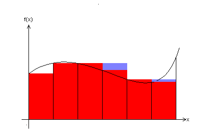 We expect to obtain an approximation value which is close to the integral. It should be clear from the graph above, that the approximation value might be slightly above or below the real value. It is one of the easier theorems of Calculus that with finer partitions we can hope for a more refined approximation result. You can see this, in the next picture where we make one refinement step by splitting every partition on the x-axis in two equal parts. The sum of the red rectangles determines now the approximation value. Note that the light blue areas have been counted for in the previous step, but not any more.