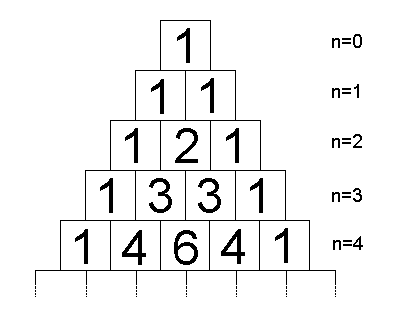A way to calculate binomial numbers which does not require factorials is to use Pascal's triangle. The triangle has a 1 at its top, every other number in the Pascal triangle is defined as the sum of the numbers to the right and to the left above. If there isn't any number, it counts as zero.