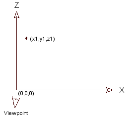 Defining Your Point of ViewIn order to draw objects in 3D space, you need to have some way of defining the space you will be working in. Typically, this means you need to think in terms of a left-handed 3D coordinate system as shown above. You should be familiar with the graphical representations of coordinate axes. For our purposes, the X and Z axes will form a plane parallel to the ground, and the Y axis will define a line perpendicular to the ground. So a player walking through a playing field would be considered to be at some position in the XZ plane, and the distance between his head and his feet would be defined in terms of Y. This is by no means the only way to position a game element in a 3D coordinate system, but it is common, and this is the convention we will use in this discussion. We are using a left-handed coordinate system, which means the positive Z axis points away from the user's eyes, or "into" the screen. Take note of the point of view, also known as the POV or "viewpoint". The POV simply defines where you are, and in what direction you are looking. In 3D space, you can be anyplace, and look in any direction. In the pictures above, notice you are at the origin and you are looking down the Z axis. We will call this the default viewpoint. You can change the viewpoint in Fastgraph quite easily with fg_3dpov().