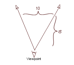 The Extents of Your VisionNow, let's consider how objects in your 3D coordinate system will appear on your screen. The fg_3Dviewport() function described earlier describes how big the image will be on the screen. But how big will the objects in it appear?The easiest way to understand it is to consider that when the ratio is one, objects have a width equal to their distance from the screen. That is, if an object is 10 feet wide, and it is 10 feet away from you, it will fill the entire screen. See Figure 1.4.