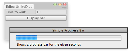 void OnGUI() { secs = EditorGUILayout.FloatField("Time to wait:", secs); if (GUILayout.Button("Display bar")) { if (secs < 1) { Debug.LogError("Seconds should be bigger than 1"); return; } startVal = (float)EditorApplication.timeSinceStartup; } if (progress < secs) EditorUtility.DisplayProgressBar("Simple Progress Bar", "Shows a progress bar for the given seconds", progress / secs); else EditorUtility.ClearProgressBar(); progress = (float)(EditorApplication.timeSinceStartup - startVal); }