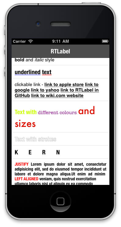 RTLabel *label = [[RTLabel alloc] initWithFrame:...]; [self addSubview:label]; [label setText:sample_text];