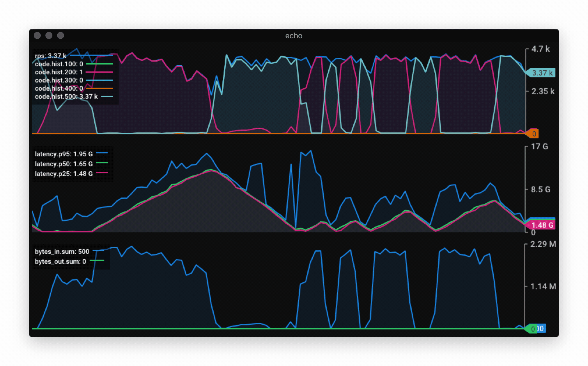 {"rps":123, "code": {"hist": {"200": 100, "300": 0, "400": 0, "500": 13}}, "latency":{"min": 4461000, "max": 5884000, "mean": 4483000}}