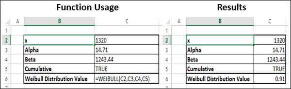 La función devuelve la distribución de Weibull. Utilice esta distribución en el análisis de confiabilidad, como calcular el tiempo medio de falla de un dispositivo.