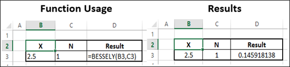 La función BESSELY devuelve la función de Bessel, Yn (x), (también conocida como función de Weber o función de Neumann), para un orden y valor especificados de x.