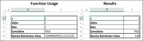 La fonction renvoie la distribution gamma. Vous pouvez utiliser cette fonction pour étudier des variables qui peuvent avoir une distribution asymétrique. La distribution gamma est couramment utilisée dans l'analyse des files d'attente.