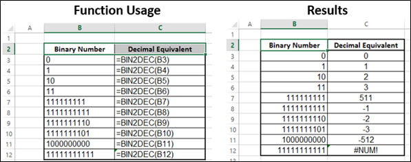 Si nombre n'est pas un nombre binaire valide, ou si un nombre contient plus de 10 caractères (10 bits), BIN2DEC renvoie le #NOMBRE! Valeur d'erreur.