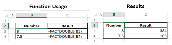 La fonction FACTDOUBLE renvoie la double factorielle d'un nombre.