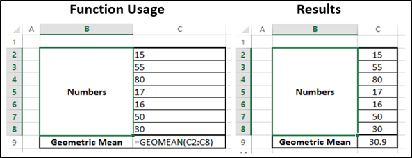 La fonction GEOMEAN renvoie la moyenne géométrique d'un tableau ou d'une plage de données positives.