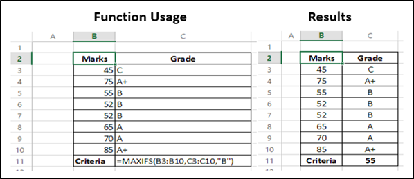 MAXIFS (max_range, criteria_range1, criteria1, [criteria_range2, criteria2], ...)
