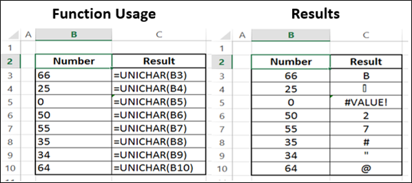 Si les nombres Unicode sont des substituts partiels et des types de données non valides, UNICHAR renvoie la valeur d'erreur # N / A.