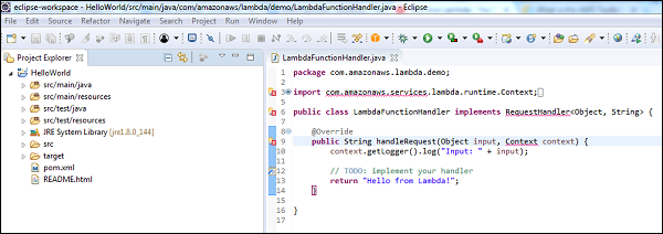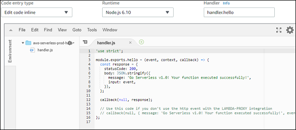 Step 1 − Téléchargez le code lambda AWS dans l'un des langages pris en charge par AWS lambda, c'est-à-dire NodeJS, Java, Python, C # et Go.