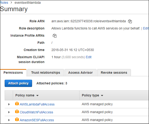 Étant donné que nous devons utiliser ce rôle avec AWS Lambda, sélectionnez Lambda et cliquez Next:Permissionscomme indiqué ci-dessus. L'écran suivant affiche le nom de la stratégie disponible selon les services AWS. Vous pouvez sélectionner la politique ici -