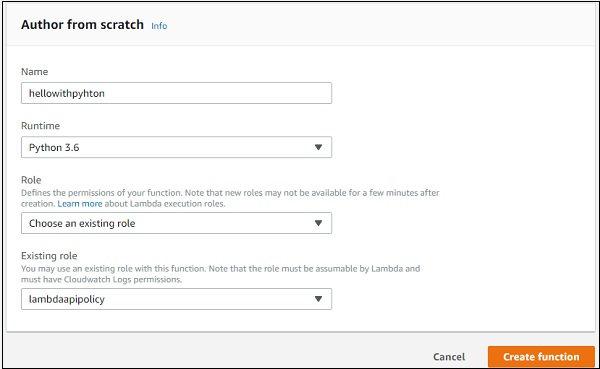 Dans la discussion plus loin, nous travaillerons sur la première option où nous créons la fonction AWS lambda en utilisant Author from scratch.