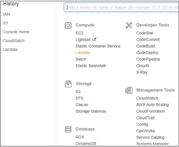 Comprenons les fonctionnalités d'AWS Console à l'aide d'un exemple. Cliquez sur Lambda (marqué ci-dessus), il sera redirigé pour créer la fonction comme indiqué ci-dessous -