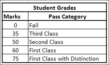 Notez que les notes de la première colonne en fonction desquelles les notes sont obtenues sont triées par ordre croissant. Par conséquent, en utilisant TRUE pour l'argument range_lookup, vous pouvez obtenir une correspondance approximative qui est requise.
