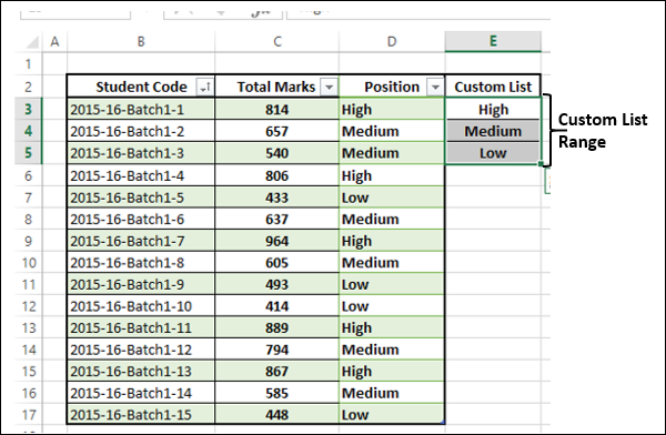 Définissez l'ordre de la liste personnalisée comme étant élevé, moyen et faible dans une plage de cellules, comme indiqué ci-dessous.