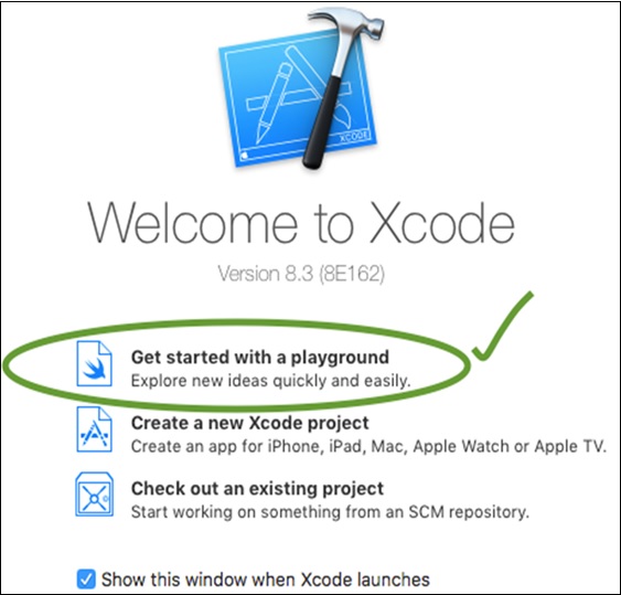 Pour créer un terrain de jeu rapide, cliquez sur l'icône Xcode et choisissez la première option, commencez avec un terrain de jeu rapide.