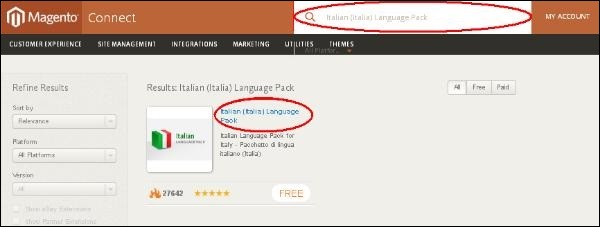 Step 1- Accédez au site officiel de Magento et recherchez un nouveau pack de langue en utilisant le champ de recherche. Par exemple, si vous souhaitez rechercherItalian langue, type Italian Language Packdans la zone de recherche et appuyez sur Entrée. Il affiche le fichier du package d'installation. Clique dessus.