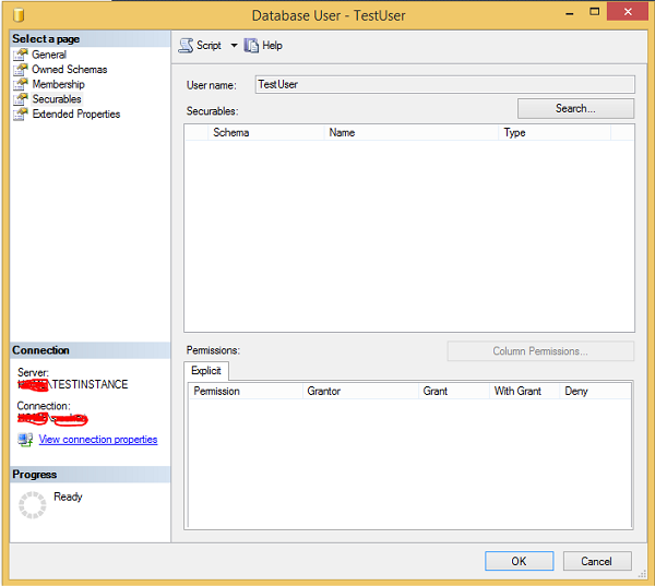 Step 5Sélectionnez l'autorisation sur «TestTable» de la base de données TestDB accordée à «TestUser». Cliquez sur OK.