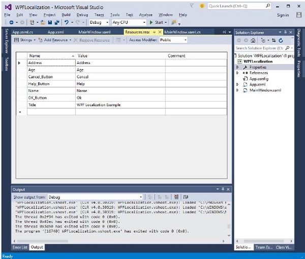 Dans WPF, les applications localisables sont très faciles à créer avec resxfichier qui est la solution la plus simple pour la localisation. Prenons un exemple simple pour comprendre comment cela fonctionne -