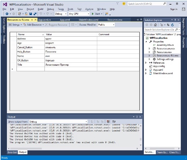 Par défaut, le programme utilise le fichier Resources.resx par défaut. Si vous souhaitez afficher le texte en langue russe qui est défini dans le fichier Resources.ru-RU.resx, vous devrez définir la culture explicitement lorsque le programme démarre dans le fichier App.xaml comme indiqué ci-dessous.