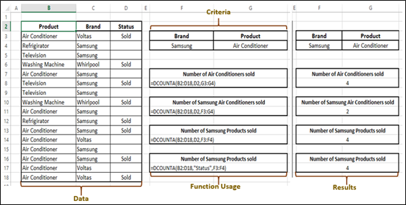 Fungsi ini mirip dengan fungsi DCOUNT, kecuali fungsi DCOUNTA menghitung semua sel yang tidak kosong. Fungsi DCOUNT hanya menghitung sel yang berisi nilai numerik.