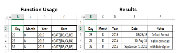 Jika hari lebih besar dari jumlah hari dalam bulan yang ditentukan, hari menambahkan jumlah hari tersebut ke hari pertama dalam bulan tersebut. Misalnya, DATE (2008, 1, 35) mengembalikan nomor seri yang mewakili 4 Februari 2008.