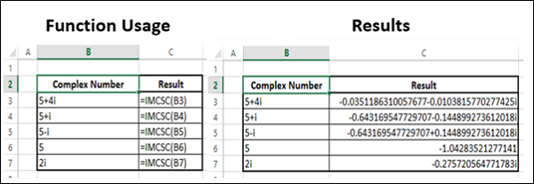Fungsi IMCSC mengembalikan kosekan sebuah bilangan kompleks dalam format teks x + yi atau x + yj.