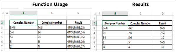 Fungsi IMSUM mengembalikan jumlah dari dua atau lebih bilangan kompleks dalam format teks x + yi atau x + yj. Saat menjumlahkan bilangan kompleks, koefisien imajiner dan riil ditambahkan secara terpisah, yaitu persamaan untuk mencari jumlah dari dua bilangan kompleks a + bi dan c + di adalah -