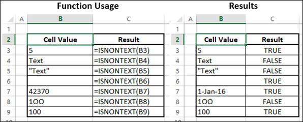 Fungsi ISNONTEXT mengembalikan nilai logika TRUE jika nilai yang ditentukan merujuk ke item apa pun yang bukan teks. Jika tidak, mengembalikan FALSE. Fungsi mengembalikan TRUE jika nilainya merujuk ke sel kosong.