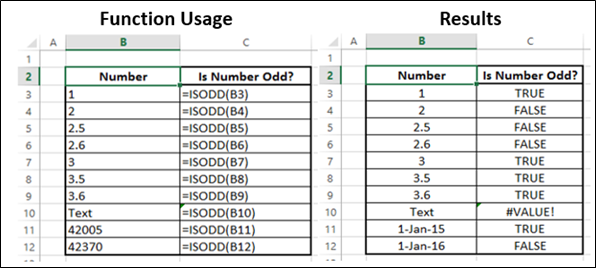 Fungsi ISODD mengembalikan TRUE jika angka ganjil, atau FALSE jika angka genap.