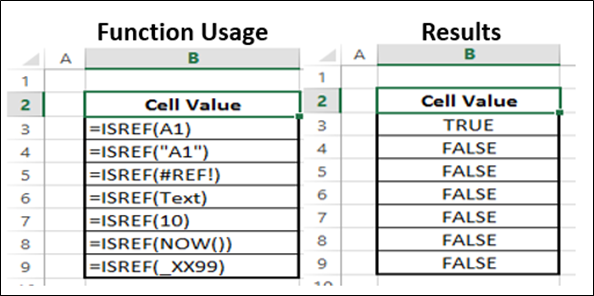 Fungsi ISREF mengembalikan nilai logika TRUE jika nilai yang ditentukan adalah referensi. Jika tidak, mengembalikan FALSE.
