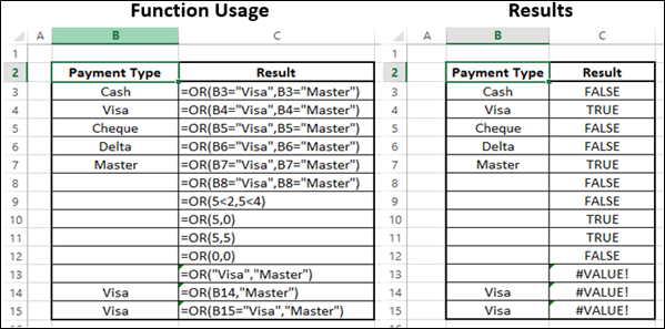 Fungsi OR mengembalikan TRUE jika ada argumen yang TRUE dan mengembalikan FALSE jika semua argumen FALSE.