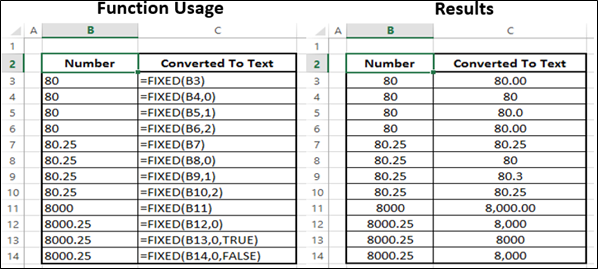 Fungsi FIXED membulatkan angka ke angka desimal yang ditentukan, memformat angka dalam format desimal menggunakan titik dan koma, dan mengembalikan hasilnya sebagai teks.