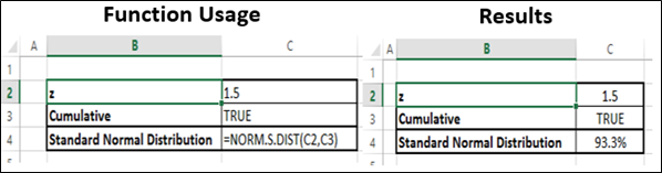 Fungsi NORM.S.DIST mengembalikan distribusi normal standar (memiliki rata-rata nol dan simpangan baku satu). Gunakan fungsi ini sebagai pengganti tabel area kurva normal standar.