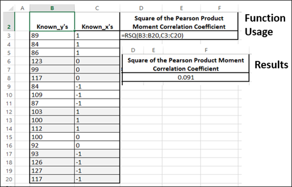 Fungsi RSQ mengembalikan kuadrat dari koefisien korelasi momen produk Pearson melalui titik data di known_y's dan known_x's.