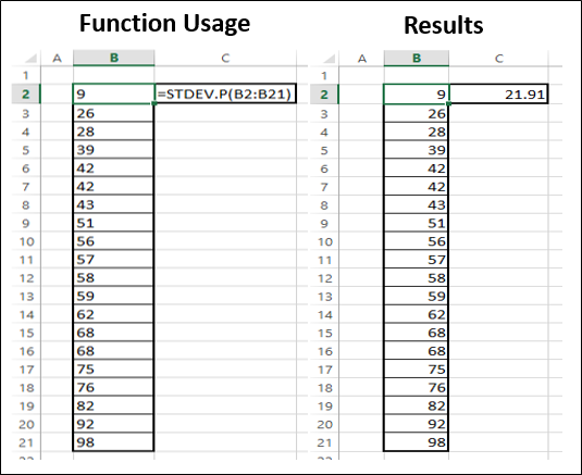 Fungsi STDEV.P menghitung simpangan baku berdasarkan seluruh populasi yang diberikan sebagai argumen (mengabaikan nilai logika dan teks).