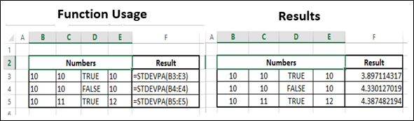 Fungsi STDEVPA menghitung simpangan baku berdasarkan seluruh populasi yang diberikan sebagai argumen, termasuk teks dan nilai logika.