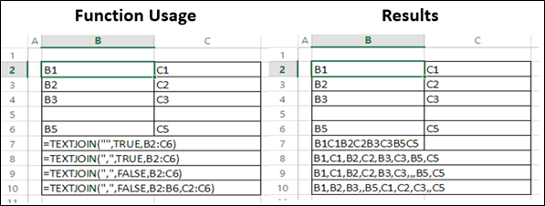 TEXTJOIN (delimiter, ignore_empty, text1, [text2], …)