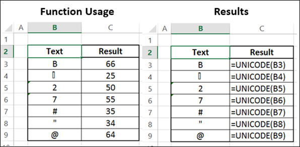 Fungsi UNICODE mengembalikan angka (titik kode) yang sesuai dengan karakter pertama teks.