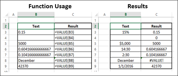 Teks bisa dalam format angka, tanggal, atau waktu konstan yang dikenali oleh Microsoft Excel. Jika teks tidak dalam salah satu format ini, VALUE mengembalikan #VALUE! nilai kesalahan.