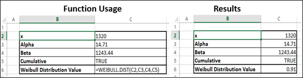 $$ F \ left (x; \ alpha, \ beta \ right) = 1-e ^ {- \ left (X / \ beta \ right) ^ \ alpha} $$