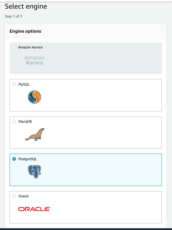 Konsol manajemen AWS adalah cara paling nyaman untuk memulai dengan RDS. Anda masuk ke konsol AWS menggunakan detail akun AWS Anda, temukan layanan RDS, lalu ikuti langkah-langkah yang ditunjukkan di bawah ini untuk membuat instans PostgreSQL.